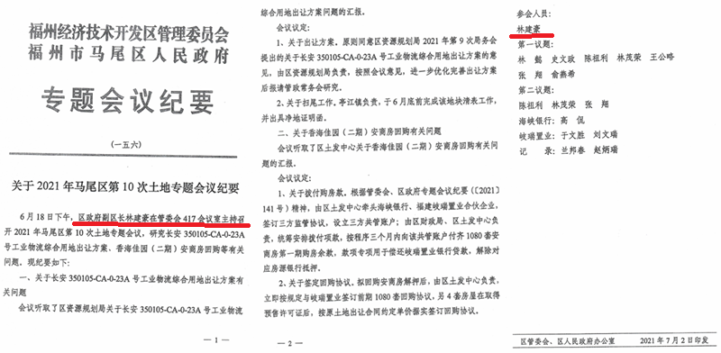更为严重的是,举报材料详细披露了三起涉嫌恶意转移国有资产的关键事件:2020年4月,在岐瑞公司无力支付1.4亿元土地出让金尾款的情况下,林建豪以区政府名义下发文件,要求区土地发展中心以安商房回购款名义,将7700万元财政资金转给该公司,用于支付部分土地出让金,而此时该项目不仅未交齐土地出让金,未签订回购协议,甚至未达到合同约定的建设进度要求,且土地发展中心分管领导曾明确反对该违规付款行为;2020年8月,林建豪无视区国房中心相关禁令,逼迫马尾区不动产中心出具证明,帮助岐瑞公司以项目土地及房屋为抵押物获得1.5亿元银行贷款,后续又通过区政府会议纪要要求土地发展中心垫付1亿元为该公司解押;2023年8月,林建豪主持专题会议并形成政府纪要,将项目停工归咎于区政府未拨付资金,导致区土地发展中心在与岐瑞公司的商事仲裁中败诉,需支付利息和罚息7900多万元,且损失仍在持续扩大。