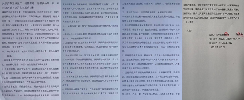 综上所述,严冬一案,在缺乏核心物证、上游源头未查清、涉案金额严重注水、关键证据存在重大瑕疵的情况下,一审法院作出了有罪判决。这不仅是对被告人合法权益的侵害,更是对司法公正的践踏。因此,我恳请上级领导及监督部门介入调查,彻查本案中的程序违法与事实错误,启动审判监督程序,还被告人严冬一个公道!