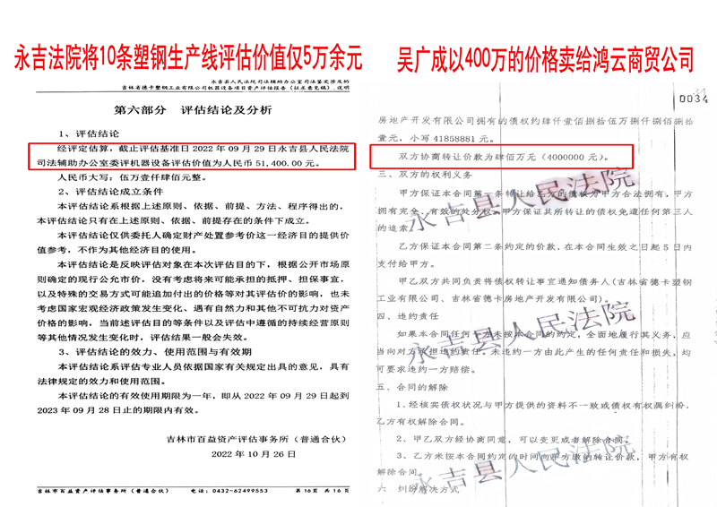 德卡塑钢公司13项抵押资产被吴广成拆分为12项资产和10条塑钢生产线分别处置。吴广成以14352958元的低价把德卡塑钢价值数千万的12项优良资产拿走,而原评估价值792万元的10条塑钢生产线,因法院长期怠于执行导致厂房坍塌、设备损毁。2022年永吉法院执行局委托吉林市百益资产评估事务所,按照2022年的时点进行评估,评估价值仅5万余元。在德卡公司提出异议后,百益公司向永吉法院执行局退卷不再评估。吴广成把10条完整的塑钢生产线全部拆分堆放,使其形同废铁。于2023年把评估价值5万元的10条塑钢生产线转手以400多万的价格卖给了吉林市鸿云商贸有限公司,获利近80倍。