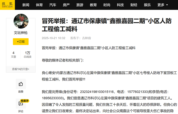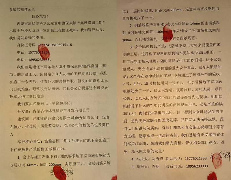 我们是刘秀锋(身份证号:232324198103015116,电话:15776021333)和李朋(电话:18956233333)。我们曾是通辽市科尔沁左翼中旗保康镇"鑫雅嘉园二期"项目的建筑工人。因目睹了令人发指的工程质量问题,我们在施工十余天后,怀着巨大的恐惧辞职。但良心的谴责让我们日夜难安,最终决定站出来,向社会公众揭露这个可能导致重大伤亡事故的隐患。