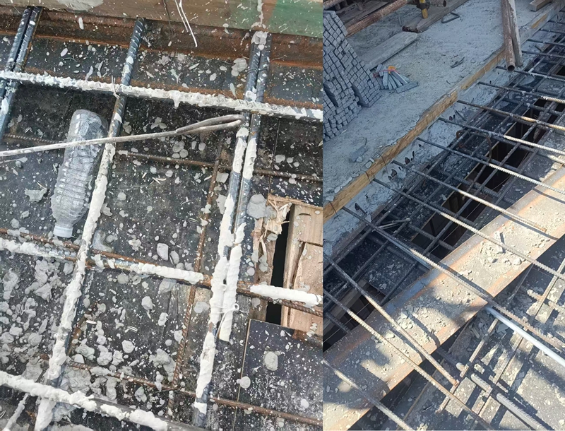 2. 钢筋规格严重缩水:底板本应铺设14mm的主钢筋,附加钢筋铺完间距应为100mm,却只铺设了附加筋,变成间距200mm。而且铺设混乱,完全不符合图纸规范。