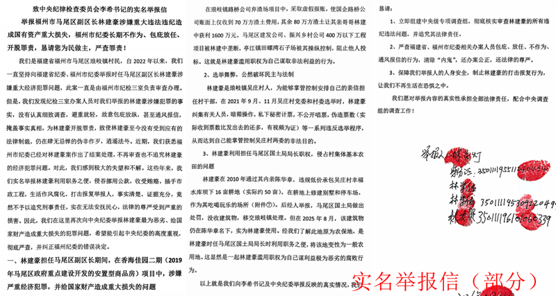 本站讯 近日,福建省福州市马尾区琅岐镇多名村民向中央纪委提交实名举报材料,直指该区副区长林建豪在任职期间涉嫌滥用职权、侵吞国有资产、收受贿赂等多项重大违法违纪行为,造成国有资产巨额损失。举报人感到更加令人愤慨的是,他们曾经多次举报,但是福州市纪委相关办案部门长期不作为、刻意包庇,导致林建豪至今未受到应有的法律制裁,其仍持续实施打击报复行为。