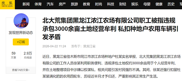 近日,黑龙江省佳木斯市同江市浓江农场种地户杜某实名举报,北大荒集团黑龙江浓江农场有限公司的工作人员徐某利用职务便利,违规承包土地权约3000余亩用于个人经营牟利,并在土地整理项目中涉嫌以权谋私,相关问题引发村民强烈不满。其间,徐某还强行扣留杜某装满化肥的农用四轮车,历经近半月才予归还,严重影响其正常生产生活。