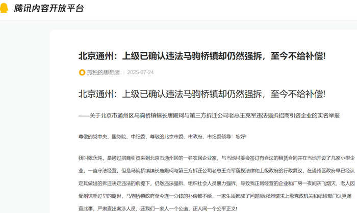 北京通州:上级已确认违法马驹桥镇却仍然强拆,至今不给补偿! 关于北京市通州区马驹桥镇镇...