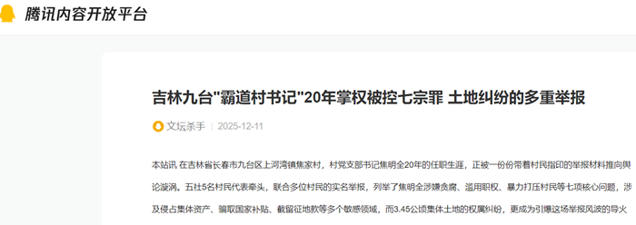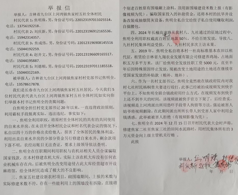 本站讯 在吉林省长春市九台区上河湾镇焦家村,村党支部书记焦明全20年的任职生涯,正被一份份带着村民指印的举报材料推向舆论漩涡。五社5名村民代表牵头,联合多位村民的实名举报,列举了焦明全涉嫌贪腐、滥用职权、暴力打压村民等七项核心问题,涉及侵占集体资产、骗取国家补贴、截留征地款等多个敏感领域,而3.45公顷集体土地的权属纠纷,更成为引爆这场举报风波的导火索。