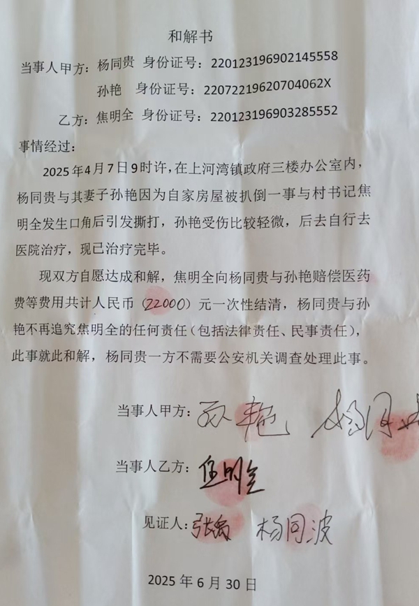 除了经济问题,焦明全还被举报多项暴力行为和强权操作。2025年4月7日,七社村民杨桐贵夫妇到镇政府索要房屋拆迁补偿款时,在办公室内与焦明全发生口角,遭到其当众殴打,导致妻子孙艳当场昏倒,住院治疗后因无力支付费用被迫回家疗养。尽管此事被拍成视频发到快手平台,但不到半天就被下架。村民透露,视频是上河湾派出所通过恐吓、拘留等手段,强迫被害人姑爷删除的,期间派出所所长还曾上门试图用金钱诱惑被害人,遭到拒绝。最终,双方签订和解协议,焦明全赔偿2.2万元,杨桐贵夫妇不再追究其任何责任。