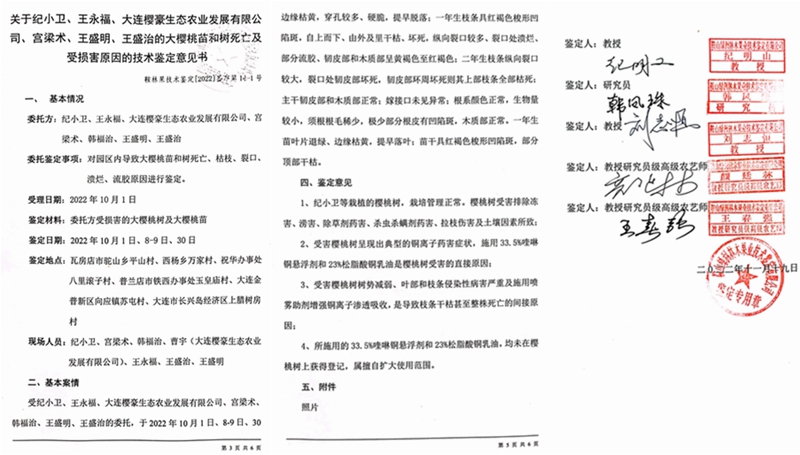 本人所转发的文章所依据的证据确凿、真实,所涉稿件的主要证据有:针对樱桃姐姐6#全能型涂干营养液的官方机构检测报告,鞍山绿洲林木果业技术鉴定有限公司出具的《技术鉴定意见书》和瓦房店市农业农村局出具的《信访事项处理意见书》等。这些权威机构均证明,殿龙公司的植保方案和农资确有问题。其中,鞍山绿洲公司的《技术鉴定意见书》有鉴定机构盖章和诸多专家的签名、盖章。该鉴定称:“纪小卫等栽植的樱桃树,栽培管理正常。樱桃树受害排除冻害、涝害、肥害、除草剂药害、杀虫杀螨剂药害、拉枝伤害、根系侵染性病害及土壤因素所致”;“受害樱桃树呈现出典型的铜离子药害症状,施用33%喹啉铜悬浮剂和23%松脂酸铜乳油是樱桃树受害的直接原因”;“所施用的33.5%喹啉铜悬浮剂和23%松脂酸铜乳油,均未在樱桃树上获得登记,属擅自扩大使用范围。”