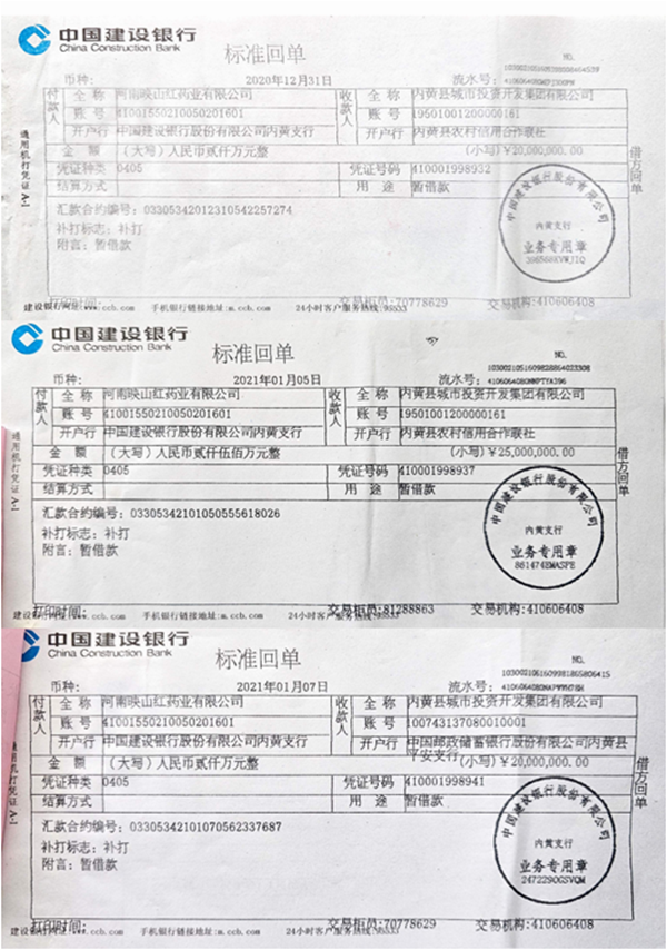 内黄县政府及城投公司公然设置违法前置条件:企业要办理土地相关手续,必须先暂借6500万元给内黄县城投公司,否则不予办理。县政府口头承诺两个月内全额归还。我公司为响应政府政策、保住企业生存,东拼西凑、甚至高息举债,分三次将6500万元足额转入内黄县城投公司指定账户,城投公司仅出具三张简单收据,拒不签订正式借款合同、不约定利息、不完善合法手续。