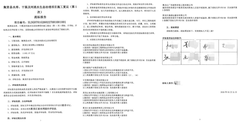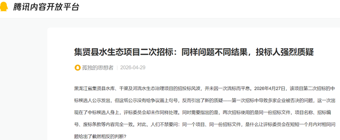 黑龙江省集贤县水库、干渠及河流水生态治理项目的招投标风波,并未因一次流标而平息。2026年4月27日,该项目第二次招标的中标候选人公示发出,但这纸公示没有给争议画上句号,反而引出了新的质疑——第一次招标中导致多家企业被否决的问题,这一次出现在了中标候选人身上,评标委员会却未作同样处理。同时需要指出的是,两次招标使用的是同一份招标文件,项目名称、招标编号、废标条款等内容完全一致。对此,人们不禁要问:同一个项目、同一份招标文件,是什么让评标委员会在短短一个月内对相同问题给出了截然相反的判断?