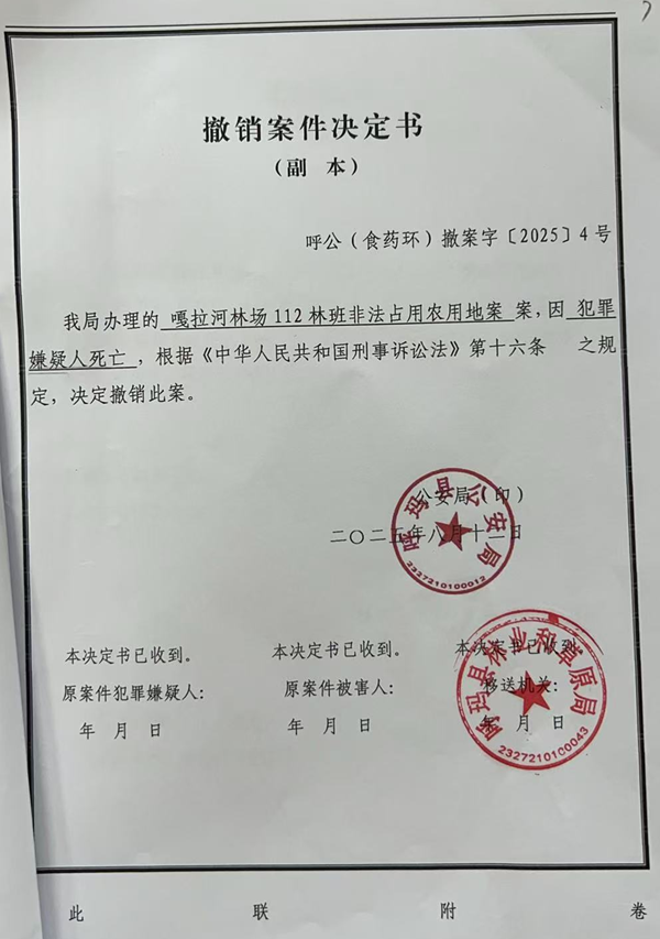 更令人费解的是执法依据:郭兆东明确表示,该地块曾因历史开荒问题被立案调查,但早在2025年8月,呼玛县公安局和呼玛县林业和草原局就已经已作出了《撤销案件决定书》,案件早已办结。根据法律规定,即便存在历史手续瑕疵,责任主体也明确为原开垦人与当年监管单位,与现承包人无关。