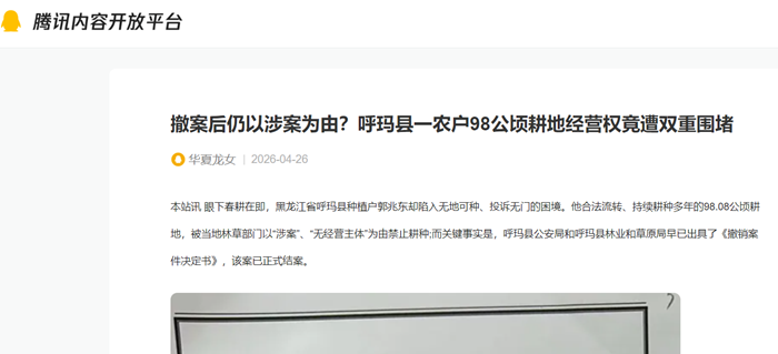 本站讯 眼下春耕在即,黑龙江省呼玛县种植户郭兆东却陷入无地可种、投诉无门的困境。他合法流转、持续耕种多年的98.08公顷耕地,被当地林草部门以“涉案”、“无经营主体”为由禁止耕种;而关键事实是,呼玛县公安局和呼玛县林业和草原局早已出具了《撤销案件决定书》,该案已正式结案。