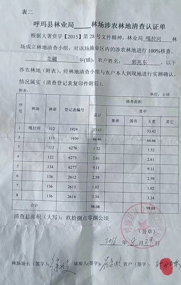 根据郭兆东提供的大量书证,其耕地权属链条完整可查:2016年从原耕种人处流转取得,同年经呼玛县嘎拉河林场清查认证,直接确权至其名下,总面积98.08公顷,其同时还持有《涉农林地清查认证单》合法凭证 。