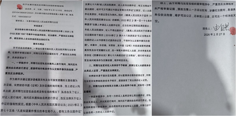 在提起再审的同时,由自然已正式提交举报材料,指控邓翔匀法官在案件审理中存在三大违法违纪行为:一是私自对案外人进行询问,制作的询问笔录未通知其质证便直接作为定案依据,严重违反法定程序;二是未核查证人身份,放任宋贵财以虚假身份出具证言;三是审理中偏袒原告孙可,对双方当事人采取双重举证标准,剥夺了其申请证人出庭的合法权利。由自然在举报材料中恳请相关部门依法彻查邓翔匀法官的行为,维护司法公正。