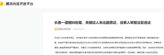本站讯 2026年春节刚过,吉林省长春市人由自然就向吉林省高级法院提起再审申请,原因是在与孙可的被继承人债务清偿纠纷一案,由自然不服长春市南关区法院(2025)吉0102民初1567号民事判决及长春市中级法院(2026)吉01民终262号民事判决,其再审申请核心直指原审程序严重违法,关键证人未出庭接受质证、法官私自调取证言并直接作为定案依据等问题。同时,由自然已向相关部门提交举报材料,指控审理该案的长春市南关区法院邓翔匀法官在案件办理中滥用职权、枉法裁判,漠视当事人合法诉讼权利。