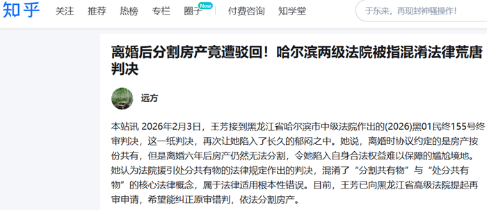 本站讯 2026年2月3日,王芳接到黑龙江省哈尔滨市中级法院作出的(2026)黑01民终155号终审判决,这一纸判决,再次让她陷入了长久的郁闷之中。她说,离婚时协议约定的是房产按份共有,但是离婚六年后房产仍然无法分割,令她陷入自身合法权益难以保障的尴尬境地。她认为法院援引处分共有物的法律规定作出的判决,混淆了“分割共有物”与“处分共有物”的核心法律概念,属于法律适用根本性错误。目前,王芳已向黑龙江省高级法院提起再审申请,希望能纠正原审错判,依法分割房产。