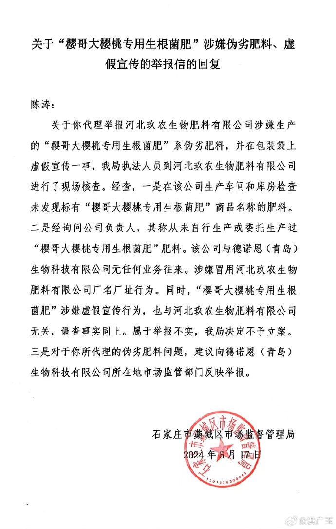 这起事件本身并不复杂:2022年前后,大连众多樱桃种植大户都因为大连同一家农资公司(某龙公司)的假冒伪劣农资产品,造成了分布在大连不同区域的多达至少1630亩樱桃树死亡,经济损失巨大,这家农资公司使用自有商标委托生产、仿冒、伪造数十种假冒伪劣肥料、农药(见图1和后面链接列表),其中多款产品经农户举报后,被盗用肥料登记证号和企业名称的企业和所在地执法部门已经正式书面回复:确认和(某龙公司)没有任何合作关系,其销售的为假冒产品(见图2、3)!